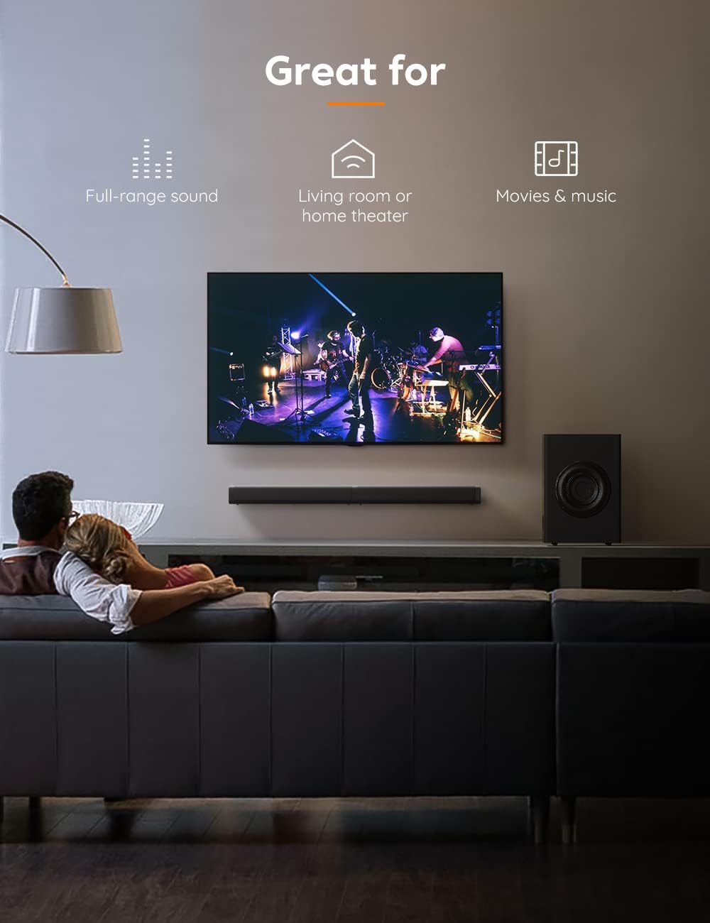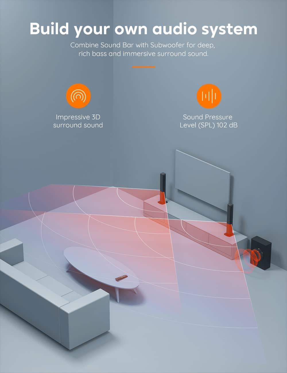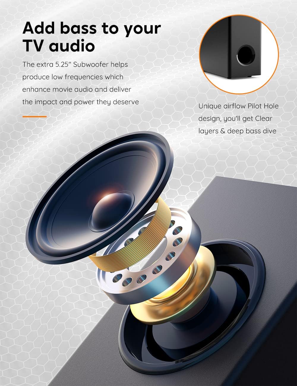 - 𝗣𝗲𝗿𝗳𝗲𝗰𝘁 𝗣𝗮𝗿𝘁𝗻𝗲𝗿 𝗳𝗼𝗿 𝗧𝗩 – This sound bar guarantees a seamless audio-visual experience with your existing TV. You can mount it directly underneath your TV with sound bar mounts under TV or on the wall with a sound bar wall mount. Get the ultimate bass experience with the sound bar with subwoofers. Experience thunderous, room-filling bass that brings your TV shows and movies to life.