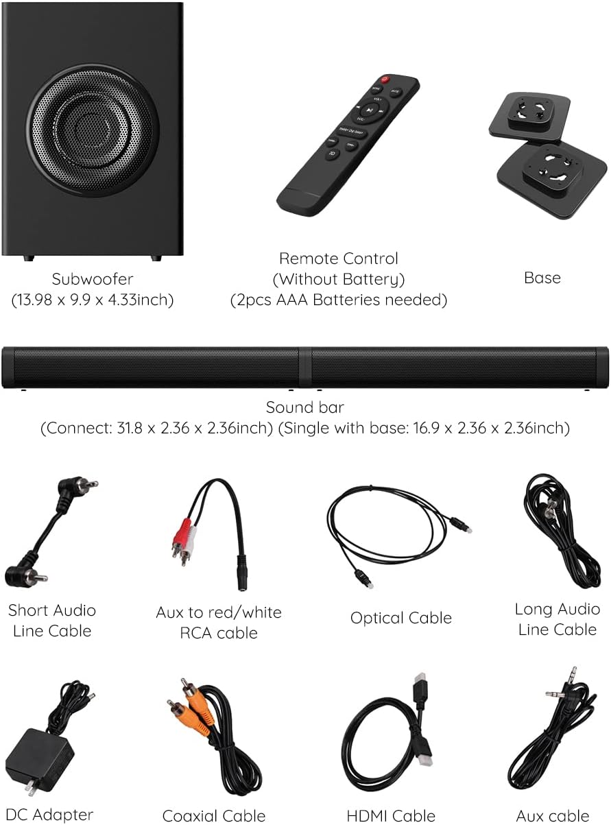 - 𝗘𝗳𝗳𝗼𝗿𝘁𝗹𝗲𝘀𝘀 𝗦𝗲𝘁𝘂𝗽 – Simplify your audio setup with a plug and play sound bar. The sound bar with HDMI makes it easy to connect to your television, and the sound bar with Bluetooth lets you effortlessly sync with your devices.